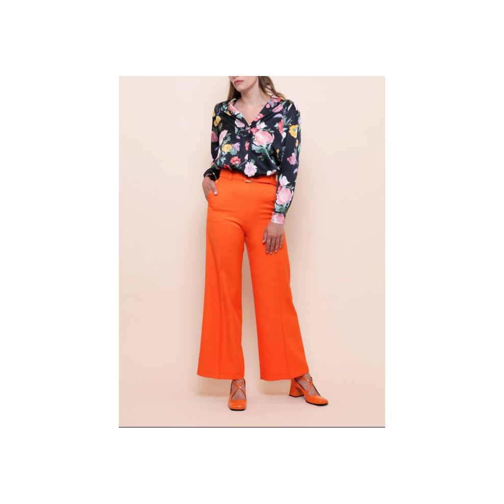 Ce modèle existe aussi en blouse motif fleurs bleues et orange.