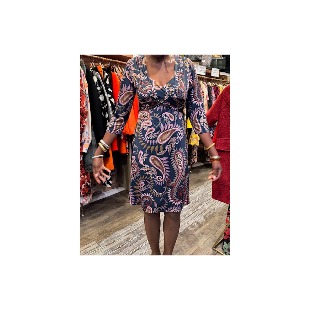 Robe fluide à manches trois-quarts imprimé cachemire(fond noir violet/rouille), Fifilles de Paris.