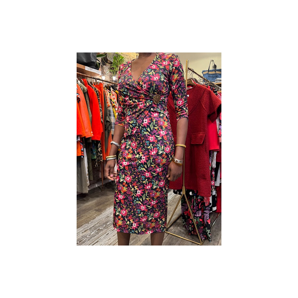 Imprimé fleuri, col V bouclé doré, taille marquée, coupe ajustée mi longue